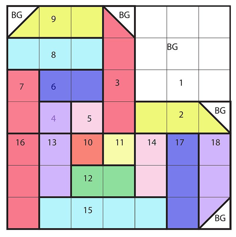 - Background fabric: 4 rectangles measuring 4.5″ x 8.5″ and 2 squares measuring 5″ x 5″